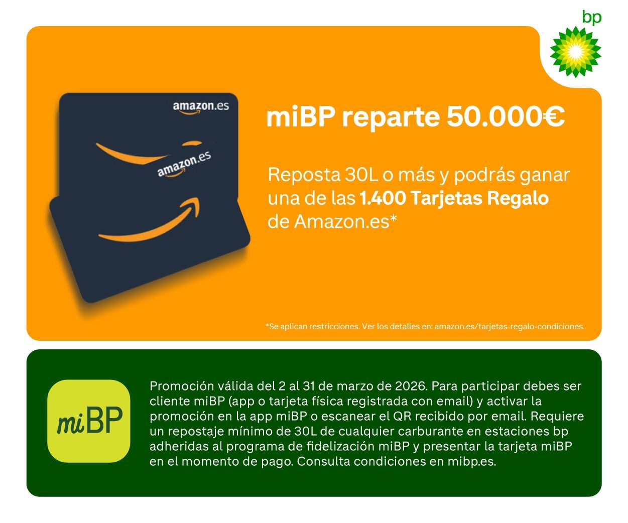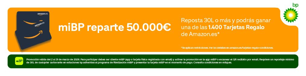 ¡Estás de suerte! Desde el 2 de marzo hasta el 31 de marzo de 2026, si respostas 30L o más de cualquier carburante, podrás conseguir una de las 1.400 Tarjetas Regalo de Amazon.es*, con premios de 10€, 50€, ¡y hasta 100€!
